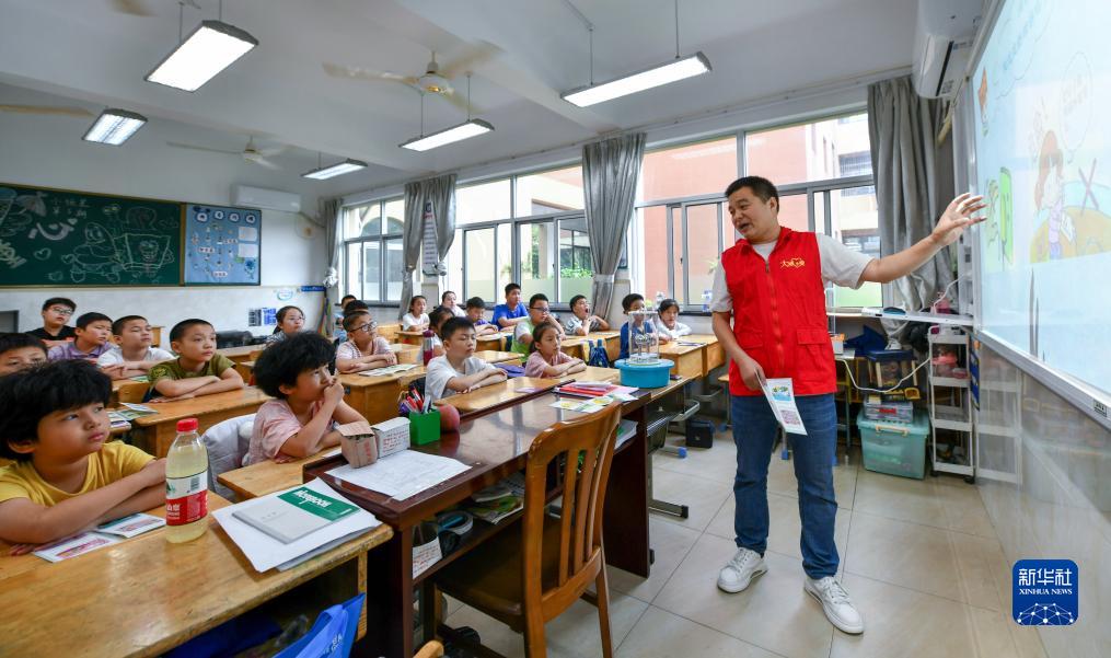7月27日,在余姚市舜北小学暑托班内,志愿者在给孩子们上暑期电力安全课。