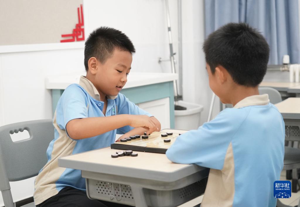 7月27日,在人大附中实验小学,参加暑期托管班的学生在下象棋。