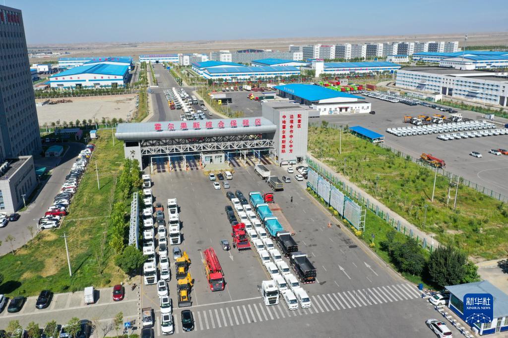 在新疆霍尔果斯综合保税区,国产商品车等待报关出境(7月26日摄,无人机照片)。