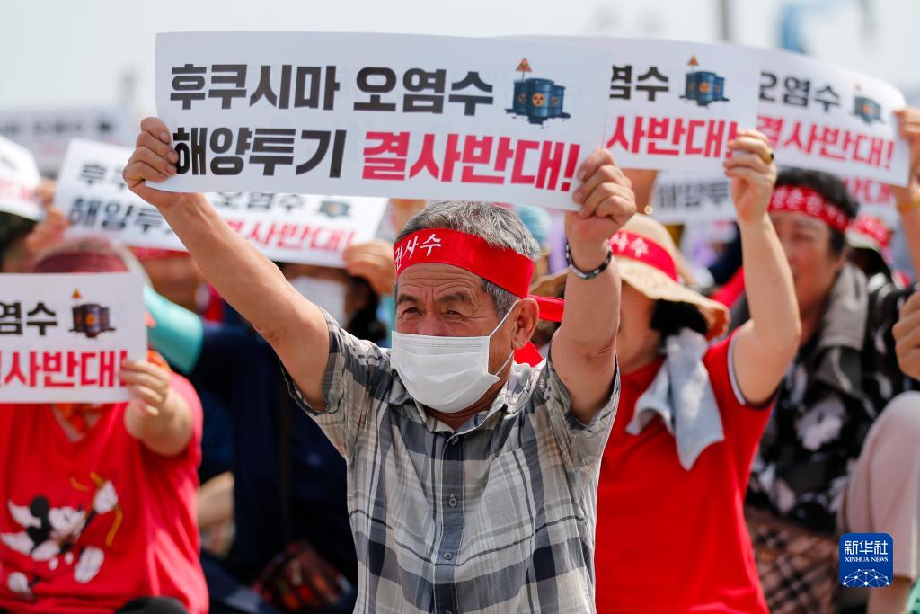 7月26日,在韩国全罗南道宝城郡沿海一带,韩国渔民手持标语参加集会活动,抗议日本核污染水排海。