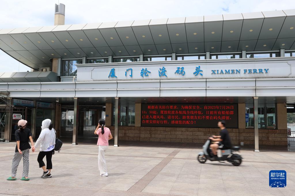 福建厦门轮渡码头电子显示屏向游客提示受台风影响有关停航的信息(7月27日摄)。