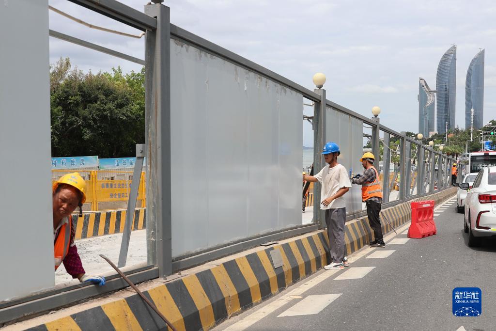 7月27日,工人在福建厦门环岛路拆除可能受台风影响的施工工地围挡。