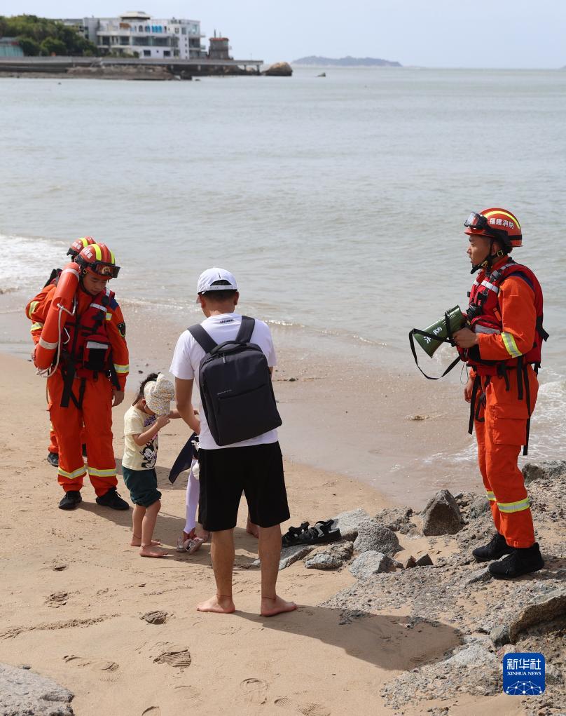 7月27日,福建省厦门市思明区厦港消防救援站消防员在厦门环岛路海边对游客进行劝离。