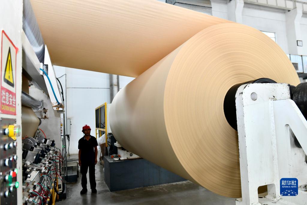 7月27日,在位于莒县的日照华泰纸业有限公司,工人在生产线加工特种纸张。