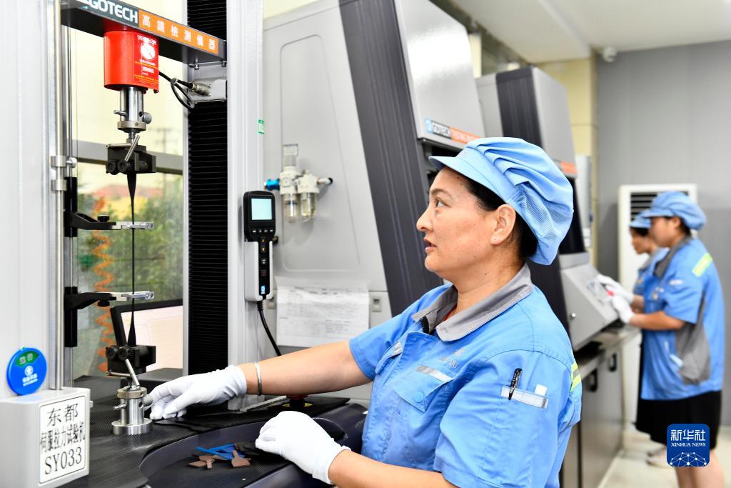 7月27日,在位于莒县的山东东都汽车部件股份有限公司,实验室工作人员对产品原料进行强度拉伸测试。