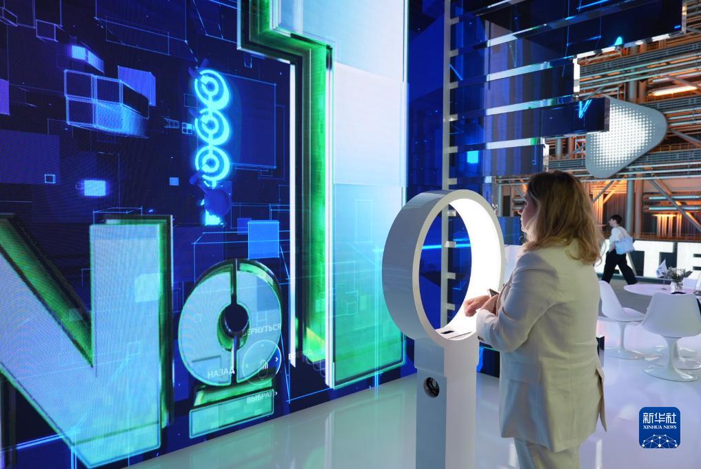 7月27日,在俄罗斯圣彼得堡,一名观众在俄非峰会会场体验用手势操控显示屏。