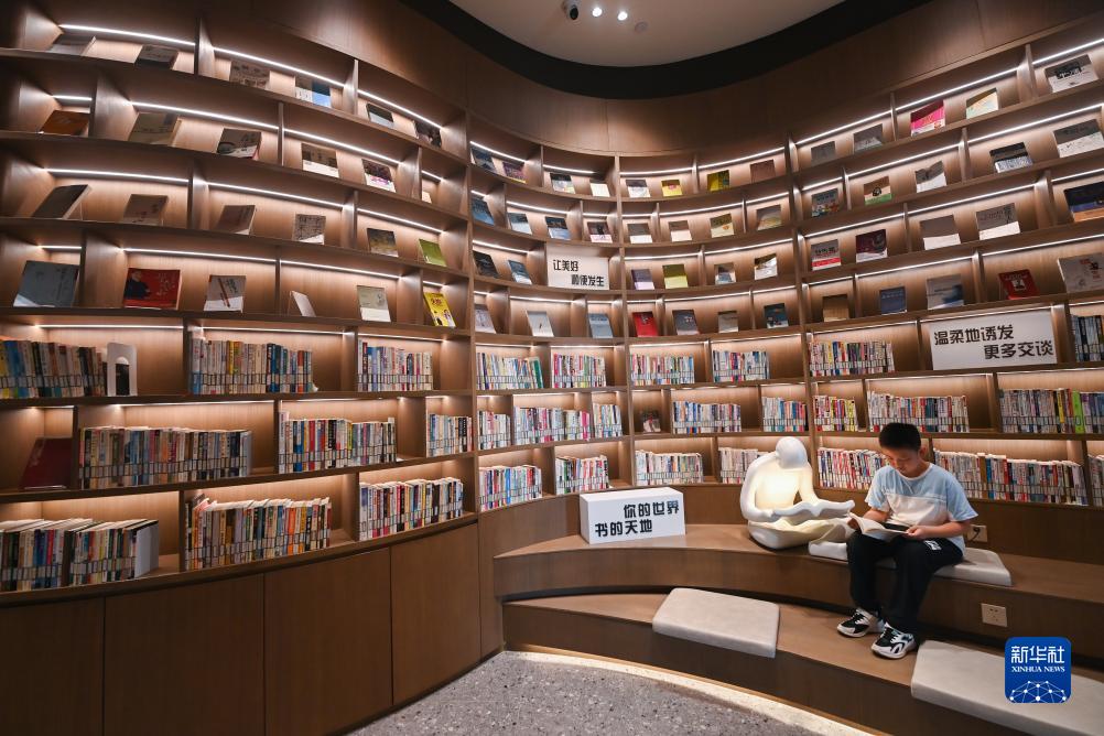 7月27日,儿童在嘉兴市南湖区余新镇渔里未来社区“向日葵亲子小屋”的天空书城里看书。