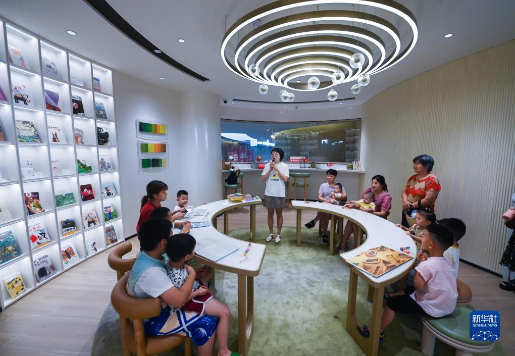 7月27日,在嘉兴市南湖区余新镇渔里未来社区“向日葵亲子小屋”的母婴沙龙内,孩子们在家长的带领下参加互动游戏。