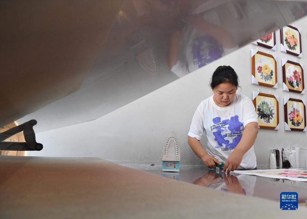 7月26日,工作人员在平乐社区的牡丹画创意产业园区工作室内装裱牡丹画。