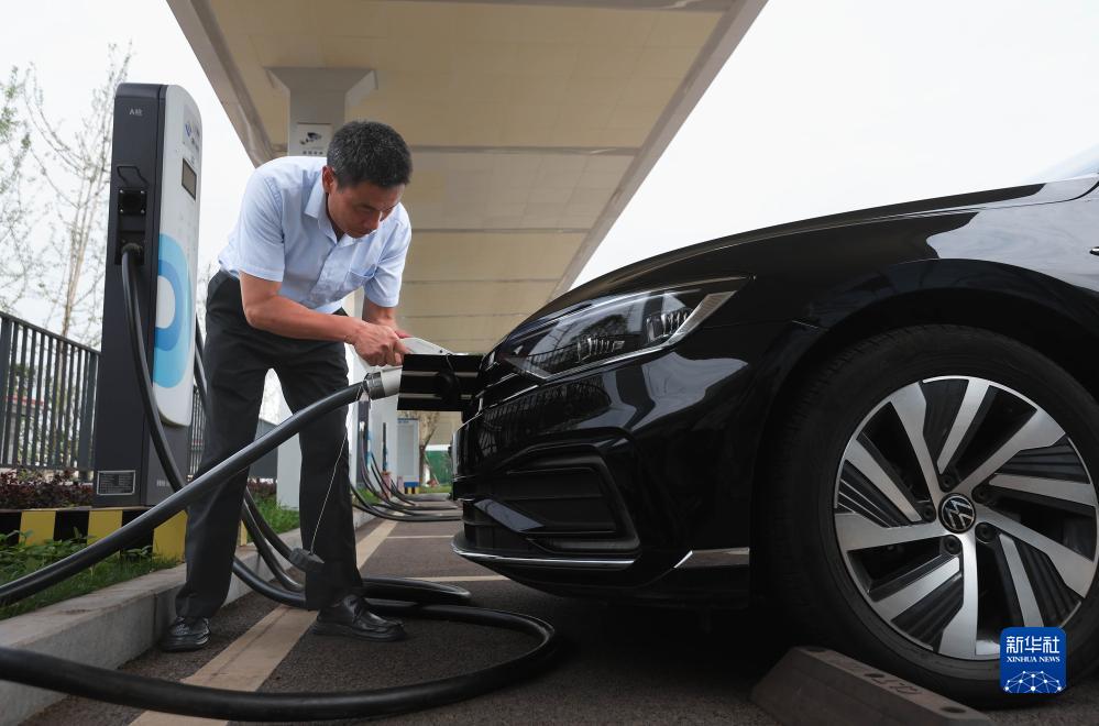 2023年6月29日,一名驾驶员在四川省宜宾市三江新区东部产业园能源港的光伏雨棚下为新能源汽车充电。