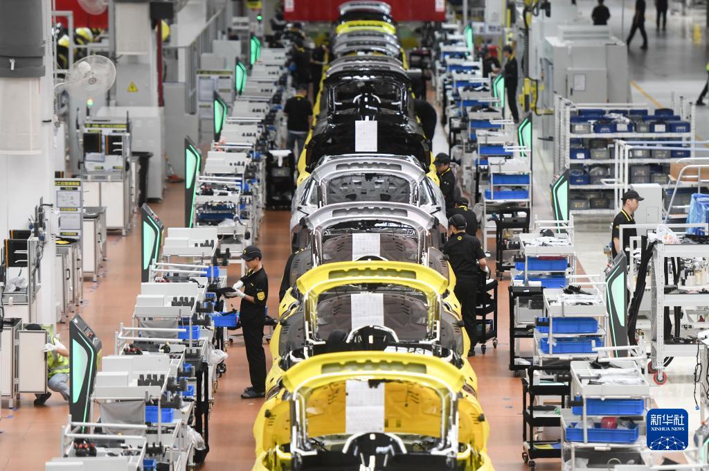 2023年6月19日,在位于湖北武汉经济技术开发区的路特斯全球智能工厂,工人在流水线上生产作业。