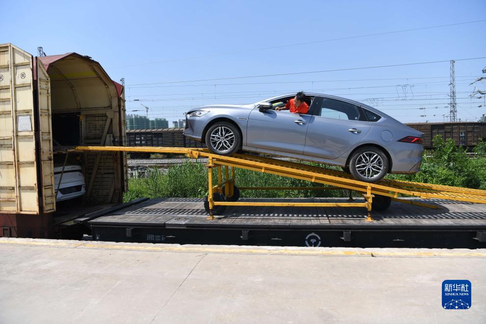 2023年5月9日,在位于合肥市长丰县的铁路水家湖货运站,工作人员装运新能源汽车。