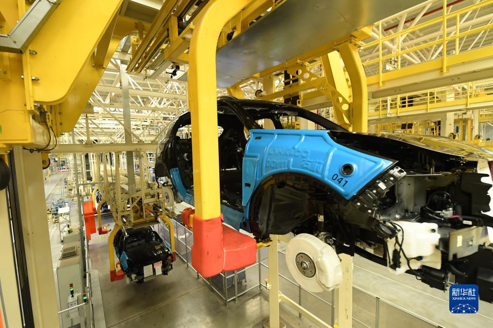 2023年4月11日,在领克汽车浙江宁波余姚工厂总装车间,全自动生产线将新能源车运送到下一个环节。