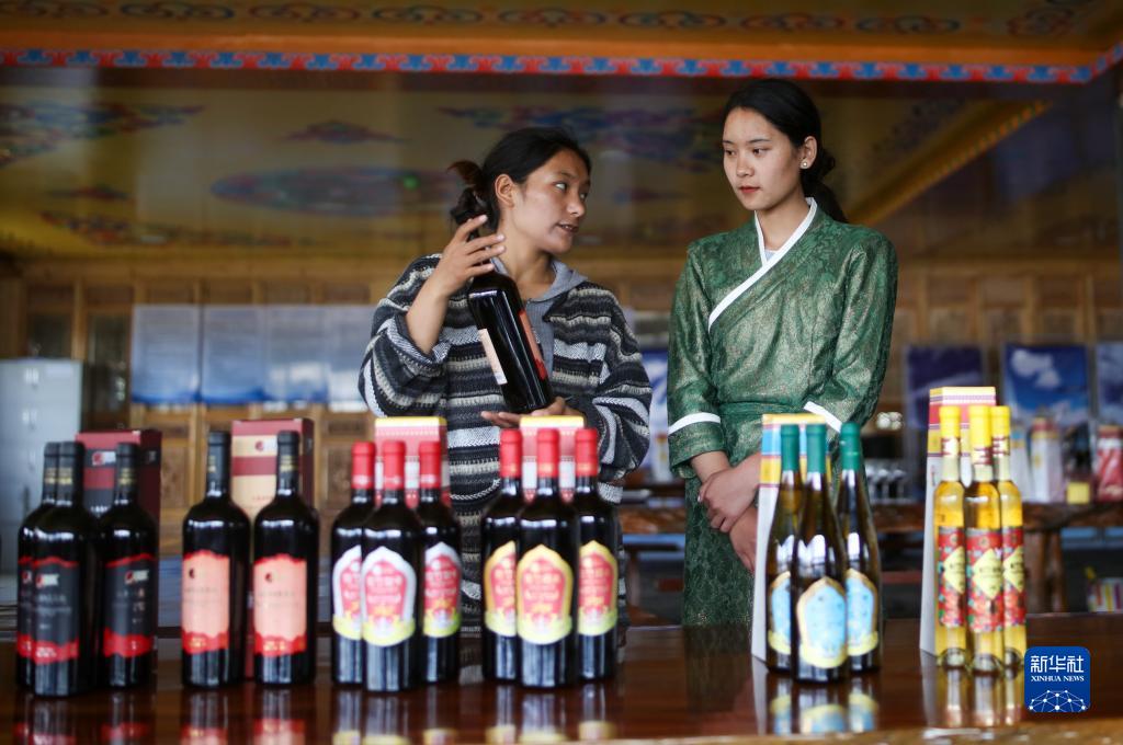 7月26日,桑日县一家葡萄酒企业的员工曲珍(左)在跟同事一起练习企业葡萄酒产品介绍。