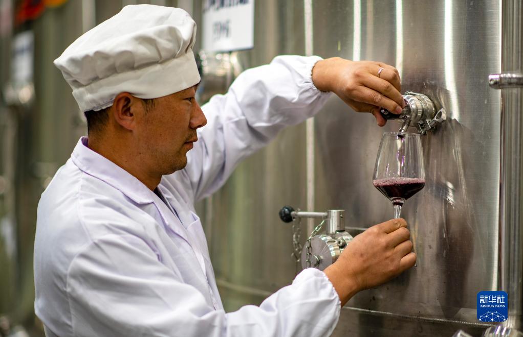 7月26日,桑日县一家葡萄酒企业的酿酒师李晓平在发酵车间检查酒样。