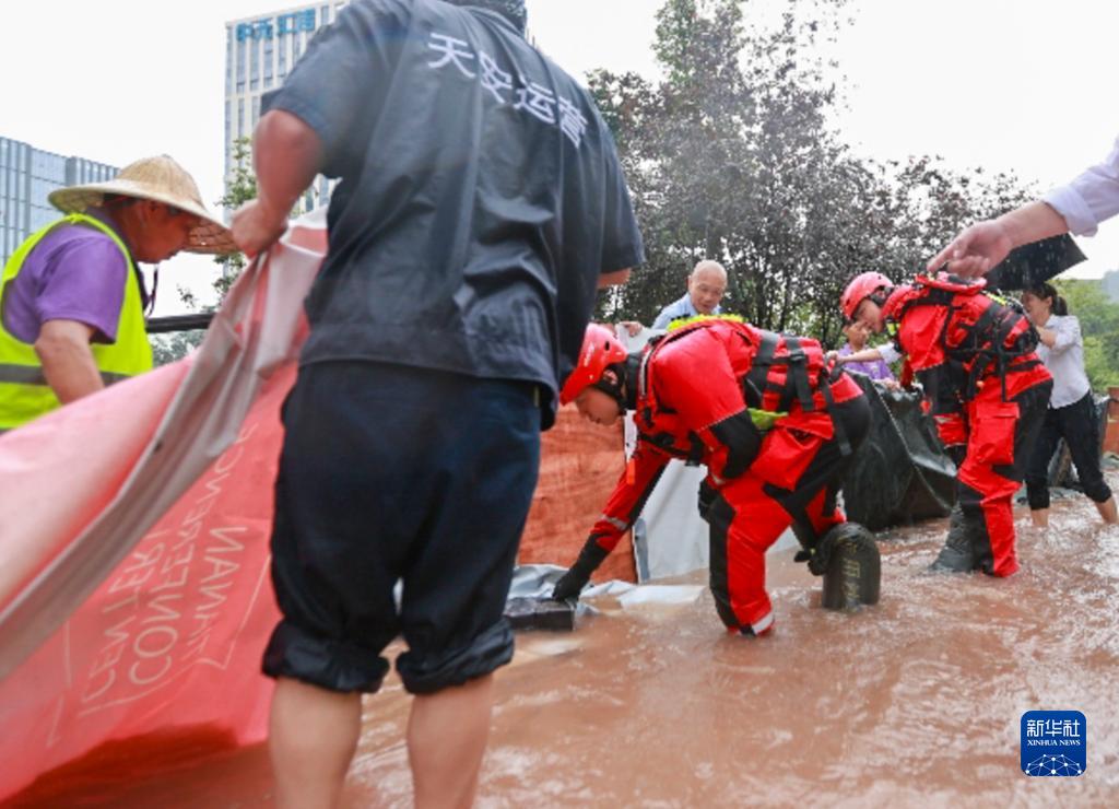7月28日,重庆大渡口区天安数码城中庭广场内,消防人员与当地工作人员用防汛沙袋等物品封堵积水。