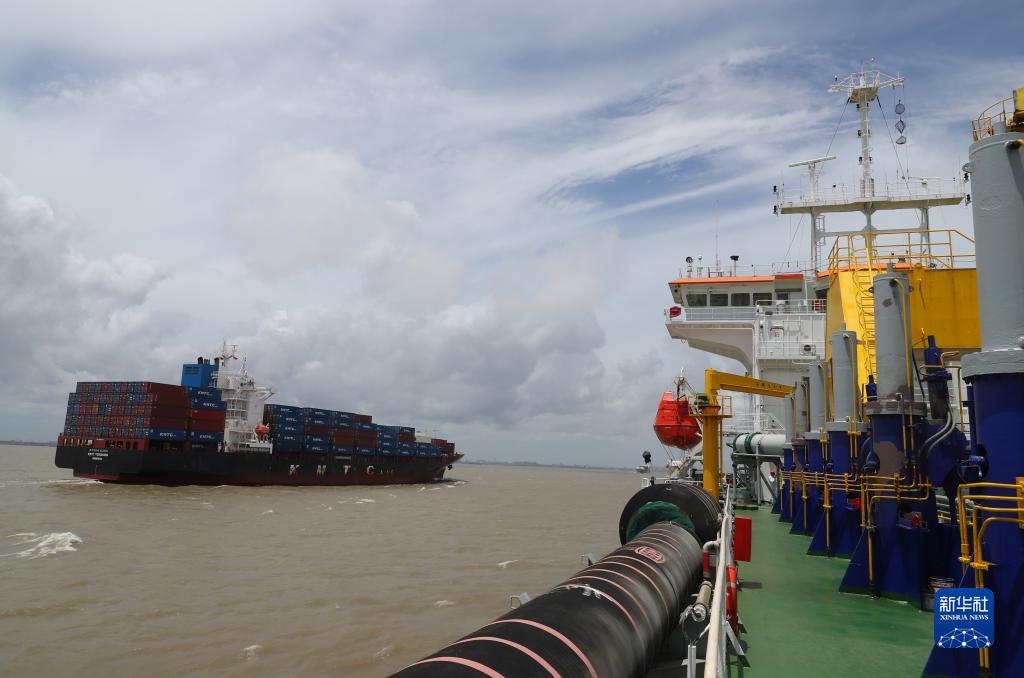 7月26日,在长江口航道,一艘满载集装箱的货轮从中交上航局耙吸式疏浚挖泥船“新海凤”轮旁驶过。