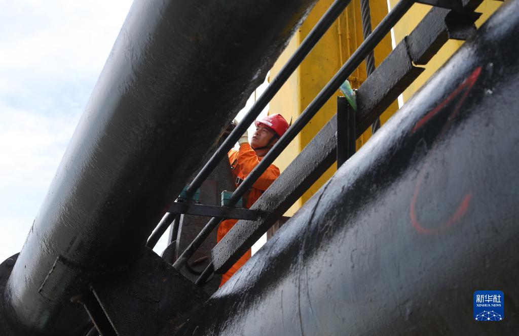 7月26日,一名水手在对完成起耙的“新海凤”轮右舷耙吸管进行例行安全检查。