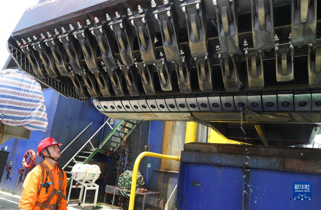 7月26日,一名水手在对完成起耙的“新海凤”轮右舷耙头进行例行安全检查。