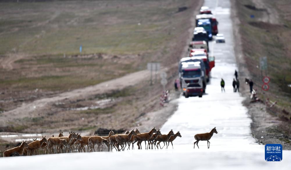 7月28日,一群藏羚羊通过青藏公路前往三江源地区的栖息地。