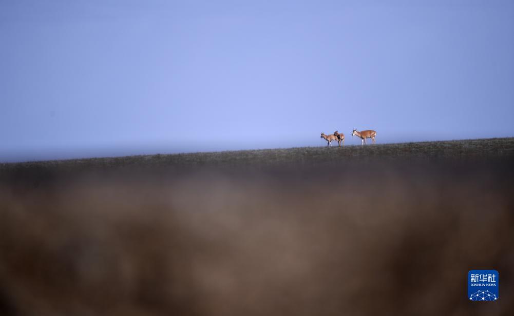 7月27日,几只藏羚羊在靠近青藏公路的可可西里境内活动。