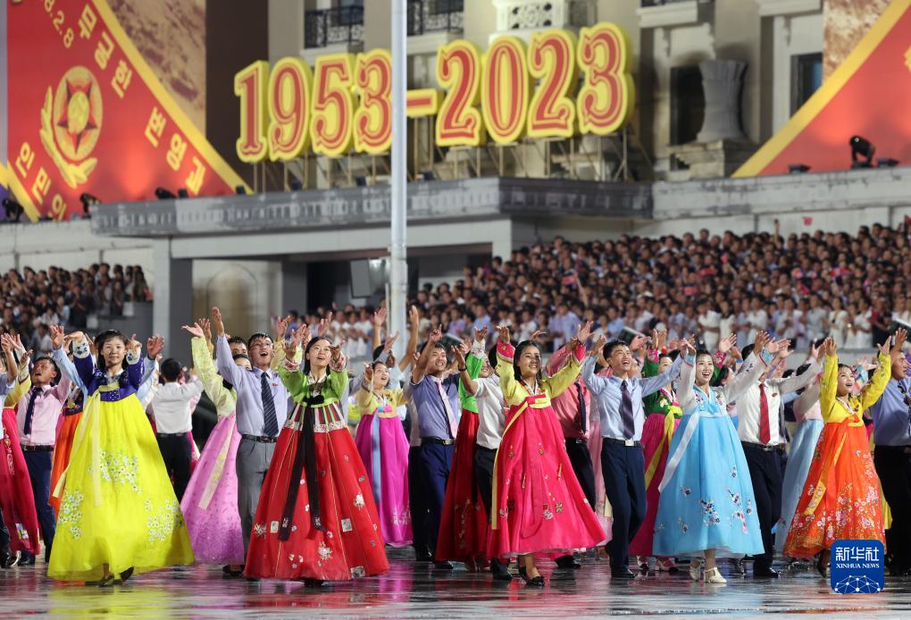 7月27日,朝鲜青年在平壤的阅兵式现场跳舞。