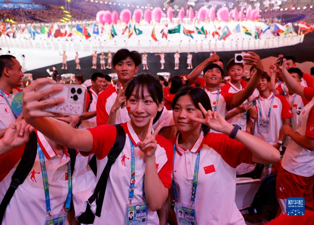 7月28日,中国大学生体育代表团成员在开幕式上。