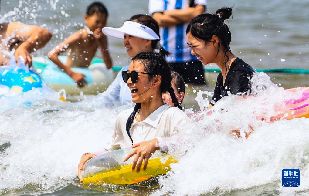 7月23日,游客在山东省威海市国际海水浴场戏水纳凉。