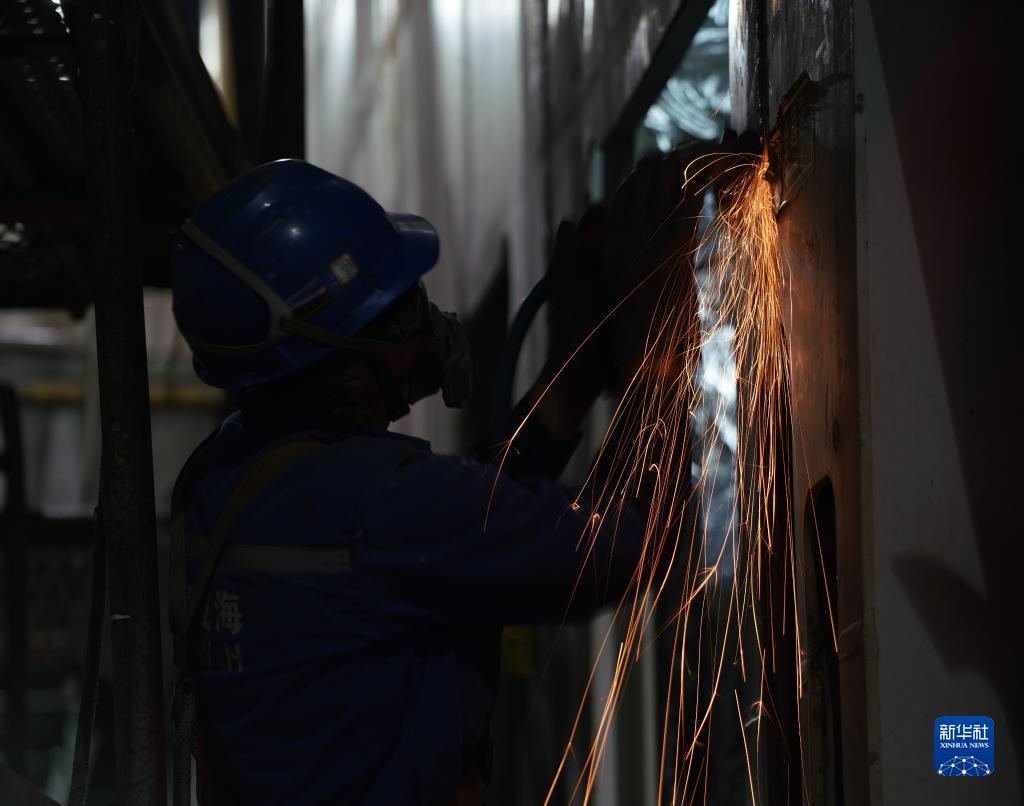 7月28日,招商局金陵船舶(威海)有限公司的工人在船体内部作业。