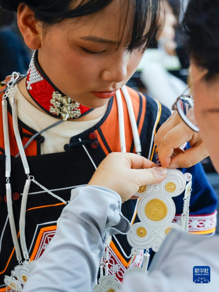 7月23日,在成都大运会开幕式彩排之前,老师帮助吉好有果整理饰品。新华社记者 沈伯韩 摄