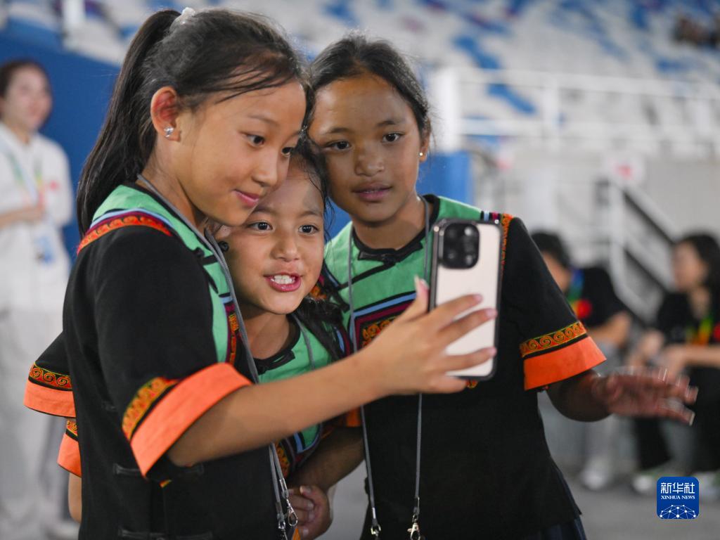 7月16日,吉合拉作(左)、马杰英(中)和俄地惹汉(右)在排练结束后和朋友视频。新华社记者 胥冰洁 摄