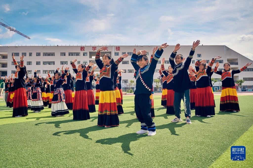 7月2日,吉朵史拉(前右四)在昭觉县万达融创红丝带爱心学校参与排练。新华社发(受访者供图)