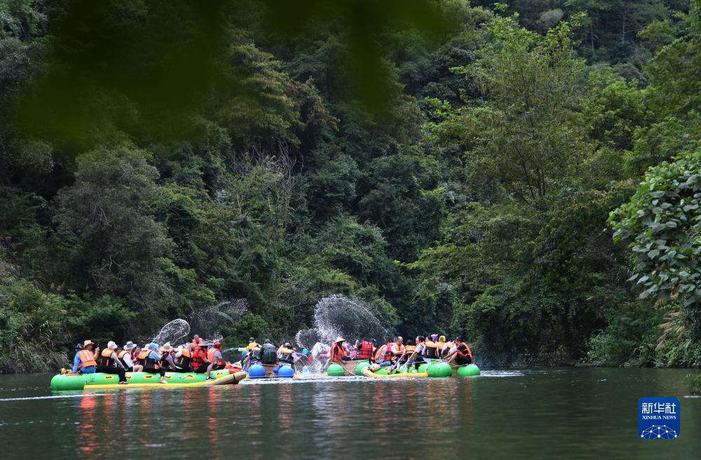 7月27日,游客在湖南省资兴市东江湖景区体验东江漂流。