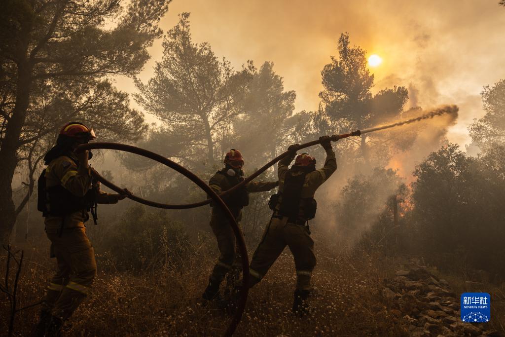 7月20日,在希腊雅典西郊的圣索蒂拉,消防员进行灭火作业。
