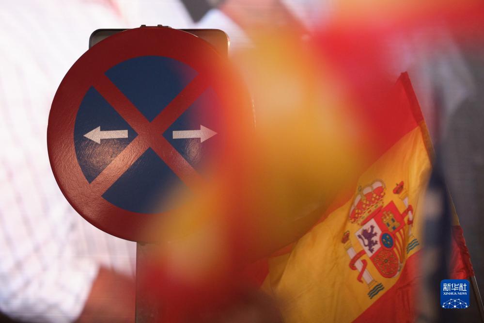 这是7月23日在西班牙马德里人民党总部大楼外拍摄的一处路标。