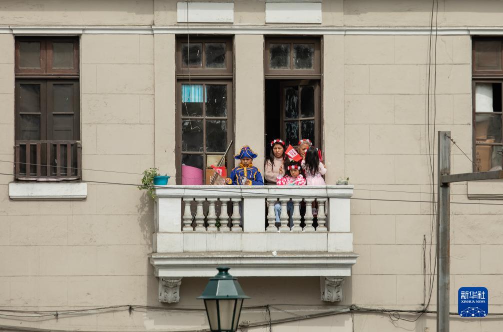 7月28日,在秘鲁首都利马,民众在阳台观看独立日庆祝活动。