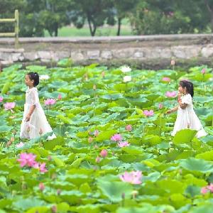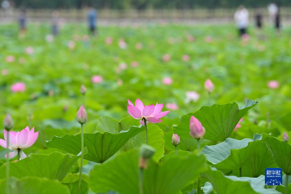 夏日,山西省太原市晋源区北大寺村的荷花竞相开放,吸引众多游客前来观赏。