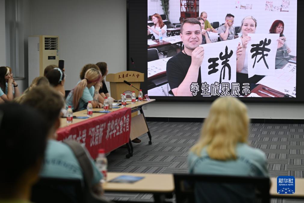 7月29日,参加夏令营的来华学生在结业式上观看视频。