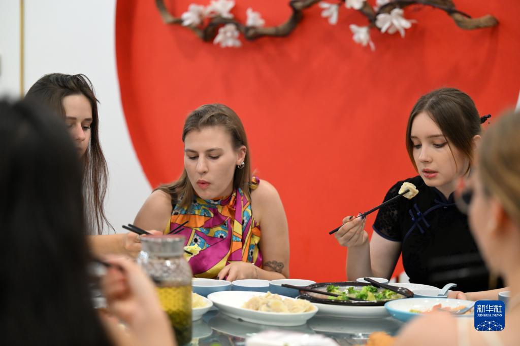 7月29日,参加夏令营的来华学生在餐厅品尝饺子。