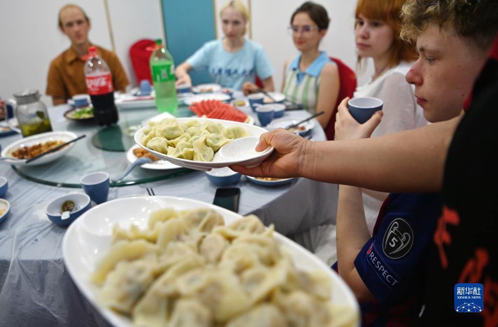 7月29日,参加夏令营的来华学生在餐厅准备品尝饺子。