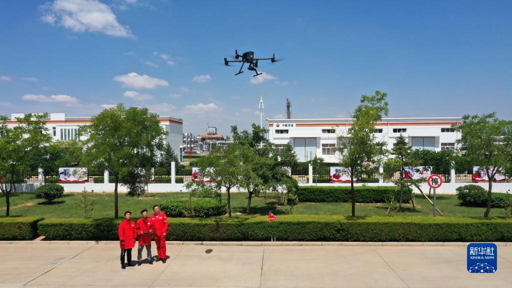 中国石油长庆油田第三采气厂苏里格天然气第二处理厂的工作人员使用无人机进行巡检(7月25日摄,无人机照片)。