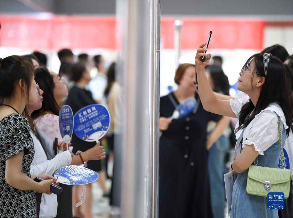 7月29日,求职者在招聘会现场查看、拍摄岗位信息。