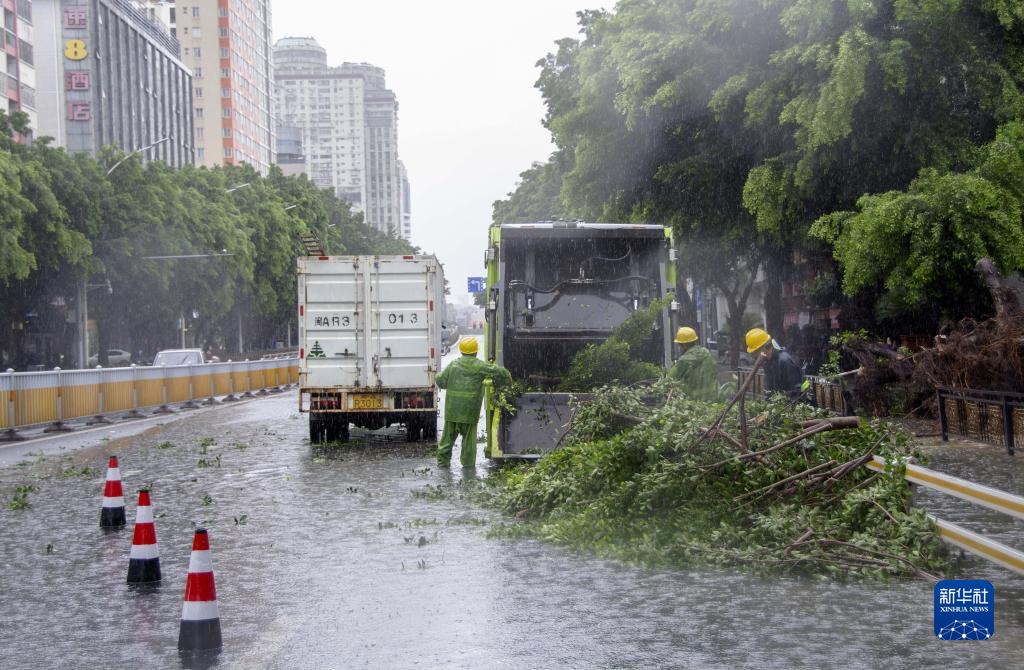 7月29日,工作人员在福州市晋安区福新路上清理被台风刮倒的树木。