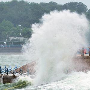 7月29日,在山东省青岛市澳门路,海浪拍向岸边。
