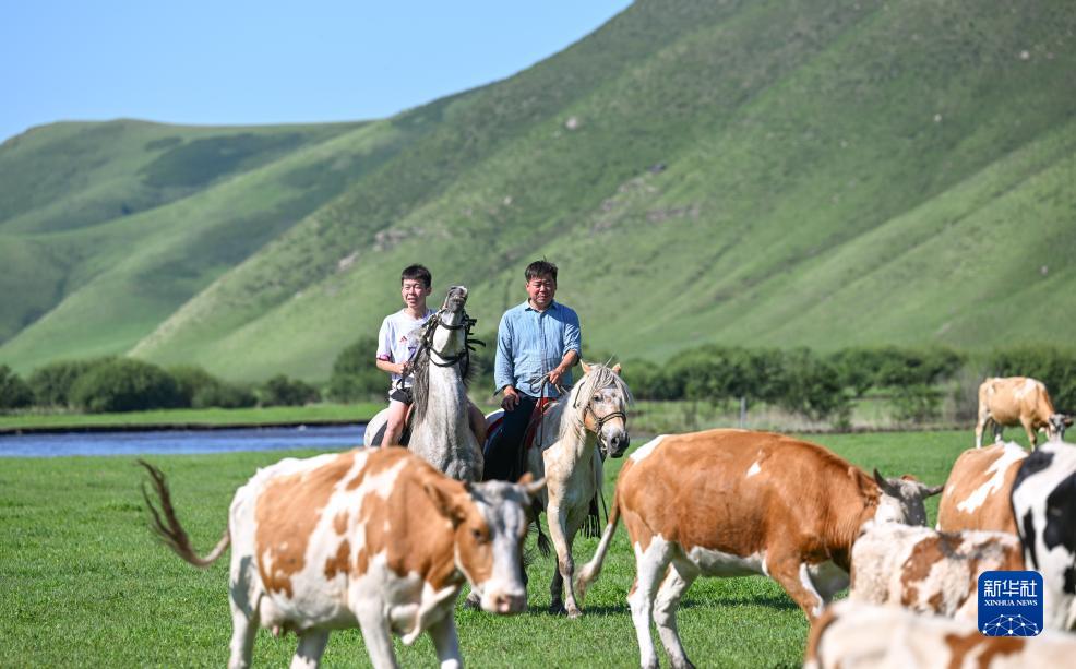 7月25日,吴苏道(右)和儿子吴苏日力格在草场上骑马赶牛。