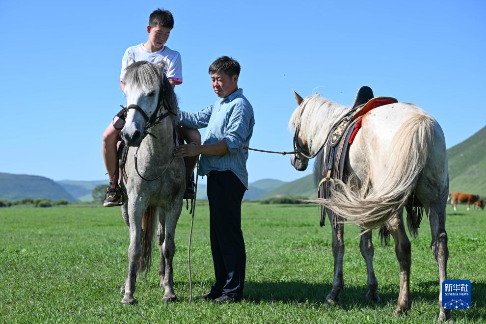 7月25日,吴苏道(右)在草场上为吴苏日力格调整马鞍。