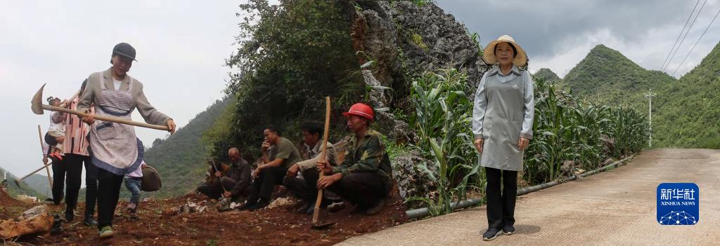 这是一张拼版照片:左图为2009年谢成芬(前左)带领村民一起修路时的资料照片(西畴县融媒体中心供图);右图为2023年7月27日,谢成芬站在修好的出村公路上(新华社记者费茂华摄)。新华社发