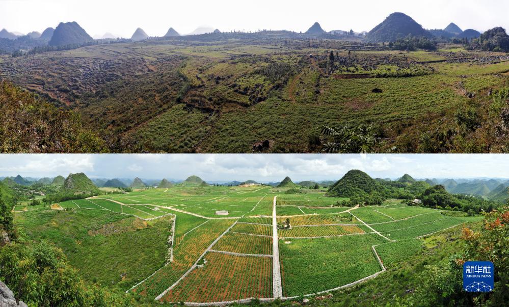 这是一张拼版照片:上图为2010年西畴县长箐村中低产田改造前的资料照片(西畴县融媒体中心供图);下图为2011年,西畴县长箐村中低产田改造后的资料照片(西畴县融媒体中心供图)。
