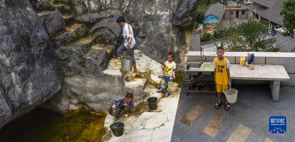 这是一张拼版照片:左图为2014年拍摄的西畴县岩头村村民在石头凹里取水,这些水是下雨时积的,当时小村民李大鑫(右)只有5岁(西畴县融媒体中心供图);右图为2023年7月26日拍摄的西畴县岩头村村民李大鑫在自己家的院子里接自来水(新华社记者费茂华摄)。新华社发