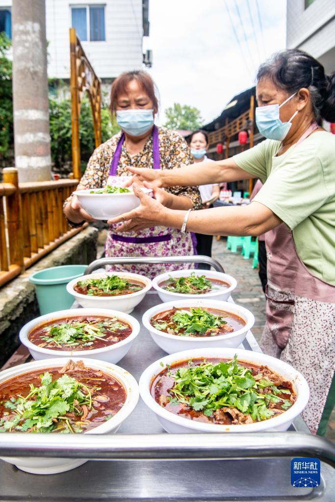 7月29日,在重庆市綦江区安稳镇,当地居民在“苗家伏羊节”上准备羊肉长桌宴。